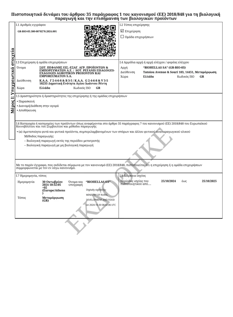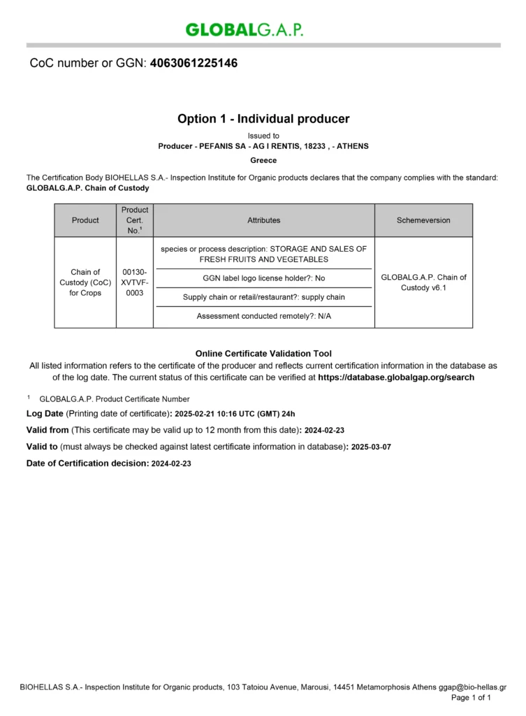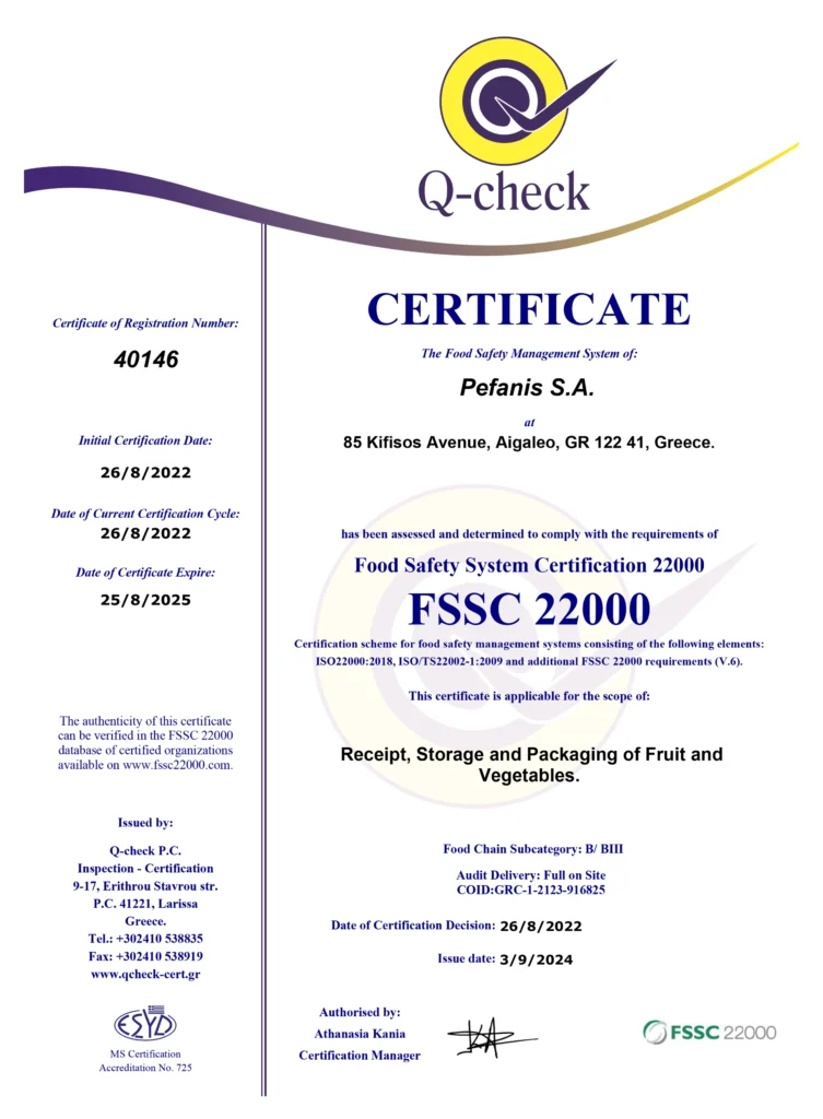 Πιστοποιητικά διασφάλισης ασφαλούς λειτουργίας & υγιεινής προϊόντων της ΠΕΦΑΝΗΣ Α.Ε.